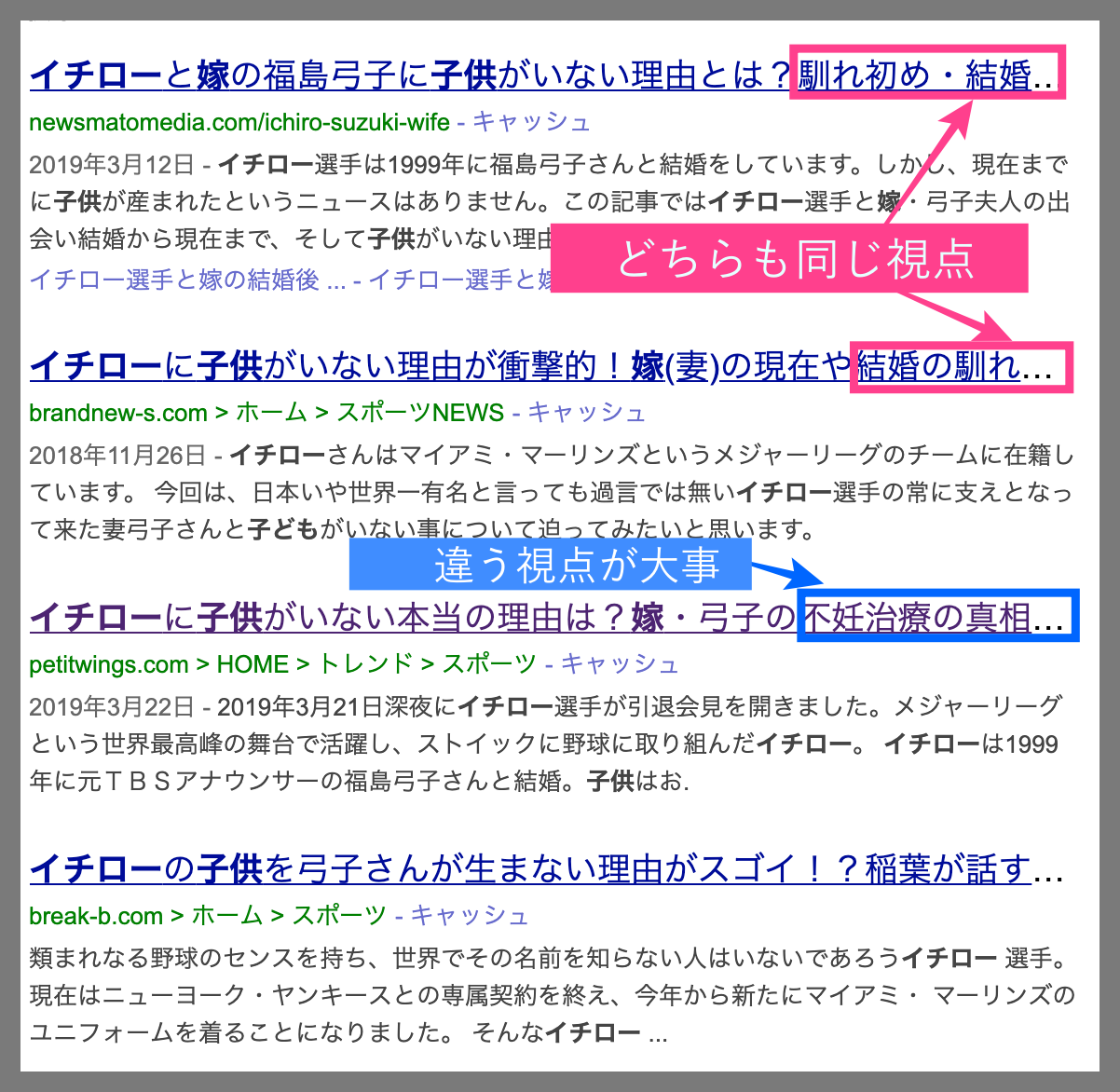 以下の画像は検索窓に「イチロー 嫁 子供」と検索をかけたときの検索結果です。