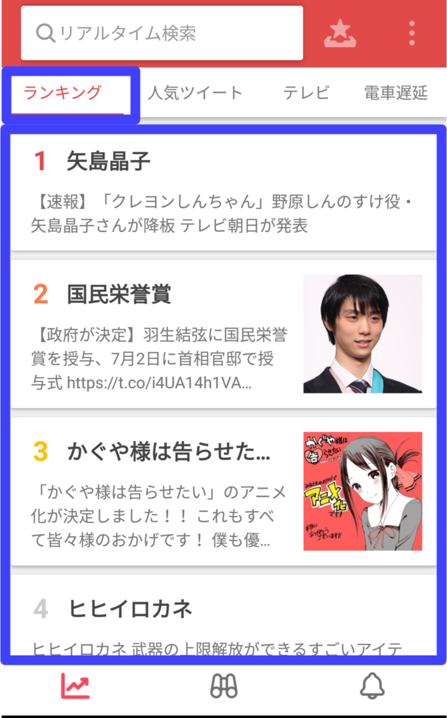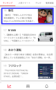 このように話題になっている事柄・人についてなどがランキング形式で表示されています。