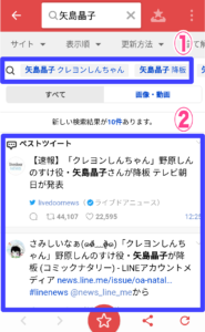 リアルタイムの検索欄に「矢島晶子」と入力をして検索をかけて調査してみましょう。