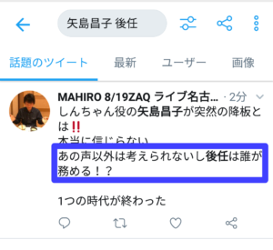 【私の視点】今回ですとリアルタイムのサジェストに出てきた「クレヨンしんちゃん 後任」はかなり需要の大きくなったキーワードだと思ったのでさらにTwitterで検索をかけてみました。