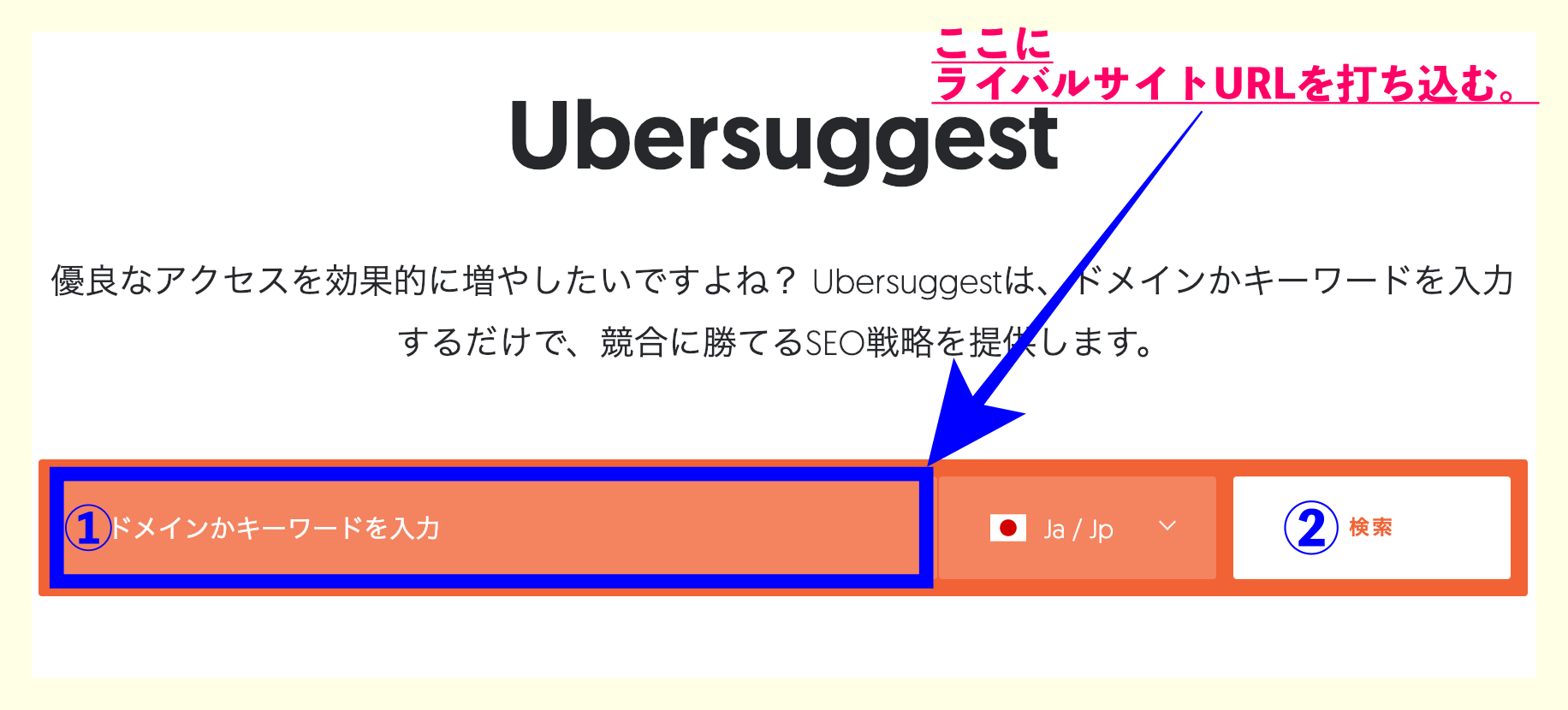 「Ubersuggest」ウーバーサジェストという名前のツールですが、これは他サイトのSEOをチェックすできる無料のツールになります。